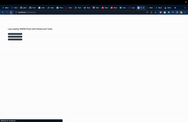 <divclass="w-full"><pclass="text-xl font-bold">Lazy loading with Hotwire and Turbo Frames</p><%= turbo_frame_tag :posts_lazy,src: posts_index_lazy_path,loading::lazydo%><%end%></div>